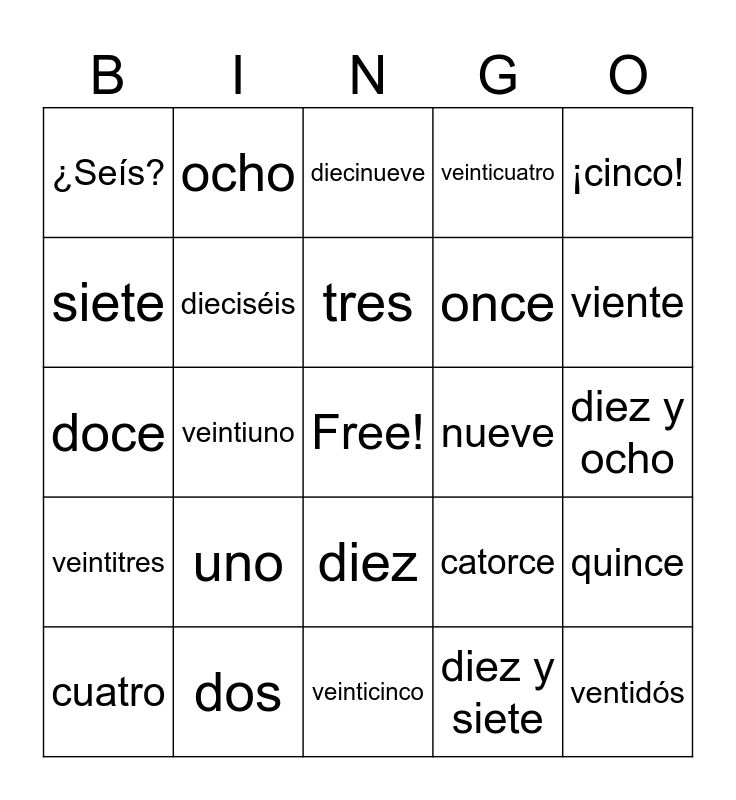 This bingo card has a free space and 24 words: uno, dos, tres, cuatro, ¡cinco!, ¿Seís?, siete, ocho, nueve, diez, once, doce, catorce, quince, dieciséis, diez y siete, diez y ocho, diecinueve, viente, veintiuno, ventidós, veintitres, veinticuatro and veinticinco.