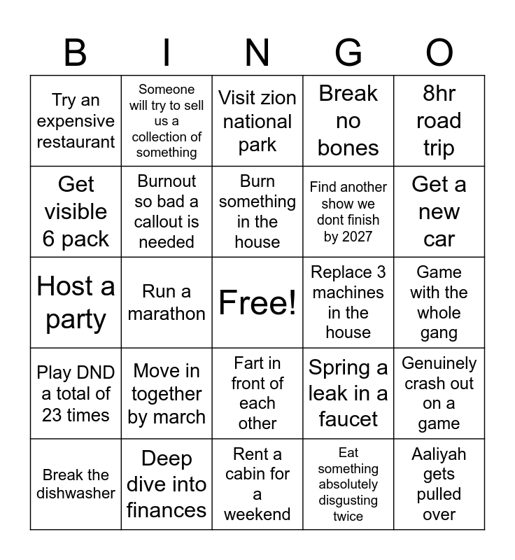 This bingo card has a free space and 24 words: Move in together by march, Deep dive into finances, Burn something in the house, Break the dishwasher, 8hr road trip, Try an expensive restaurant, Get visible 6 pack, Someone will try to sell us a collection of something, Replace 3 machines in the house, Fart in front of each other, Find another show we dont finish by 2027, Host a party, Spring a leak in a faucet, Genuinely crash out on a game, Burnout so bad a callout is needed, Eat something absolutely disgusting twice, Game with the whole gang, Visit zion national park, Get a new car, Run a marathon, Aaliyah gets pulled over, Play DND a total of 23 times, Break no bones and Rent a cabin for a weekend.