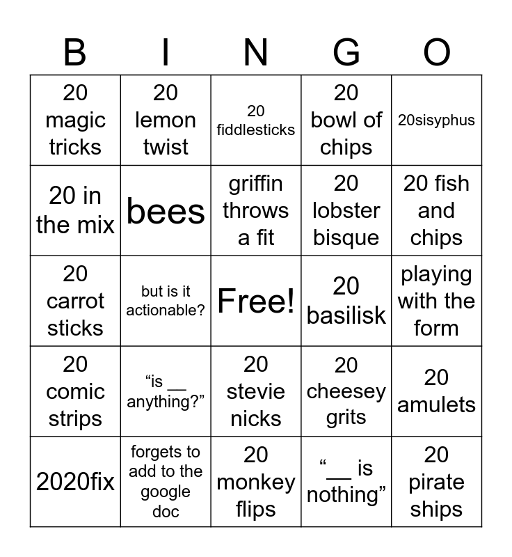 This bingo card has a free space and 24 words: “is __ anything?”, forgets to add to the google doc, griffin throws a fit, 2020fix, 20sisyphus, 20 magic tricks, 20 in the mix, 20 lemon twist, 20 basilisk, 20 stevie nicks, 20 lobster bisque, 20 carrot sticks, 20 cheesey grits, 20 amulets, bees, “__ is nothing”, playing with the form, 20 fiddlesticks, 20 fish and chips, but is it actionable?, 20 pirate ships, 20 comic strips, 20 bowl of chips and 20 monkey flips.