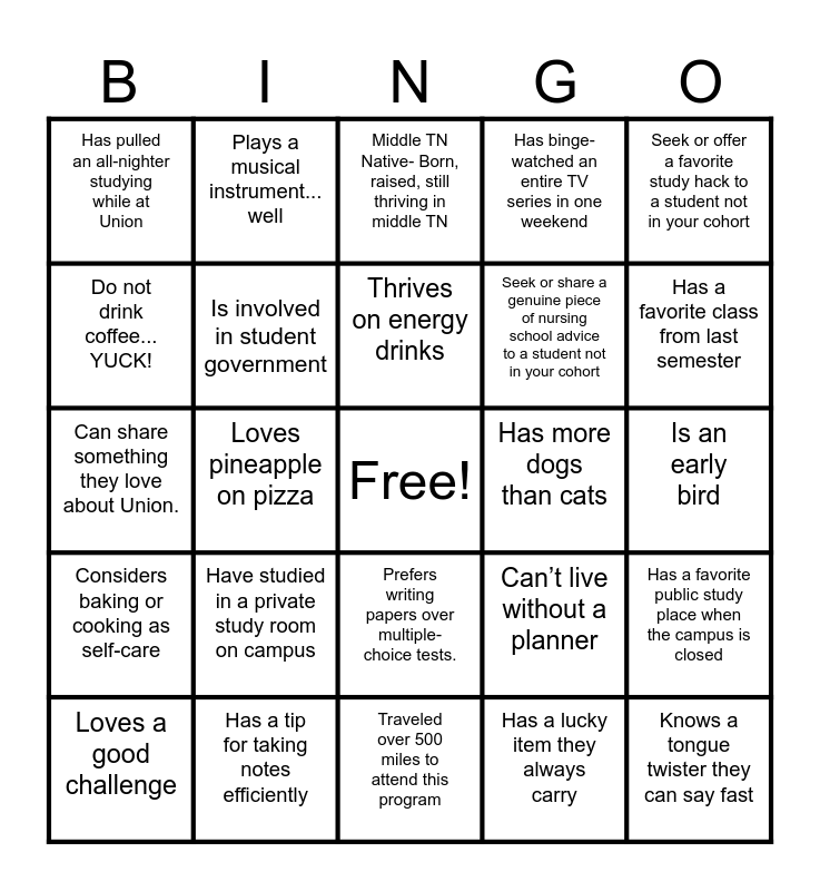 This bingo card has a free space and 25 words: Have studied in a private study room on campus, Traveled over 500 miles to attend this program, Thrives on energy drinks, Loves a good challenge, Seek or offer a favorite study hack to a student not in your cohort, Has pulled an all-nighter studying while at Union, Do not drink coffee... YUCK!, Plays a musical instrument... well, Has more dogs than cats, Prefers writing papers over multiple-choice tests., Seek or share a genuine piece of nursing school advice to a student not in your cohort, Can share something they love about Union., Can’t live without a planner, Has a favorite public study place when the campus is closed, Is involved in student government, Has a sweet tooth, Is an early bird, Middle TN Native- Born, raised, still thriving in middle TN, Has a favorite class from last semester, Loves pineapple on pizza, Knows a tongue twister they can say fast, Has a tip for taking notes efficiently, Considers baking or cooking as self-care, Has binge-watched an entire TV series in one weekend and Has a lucky item they always carry.