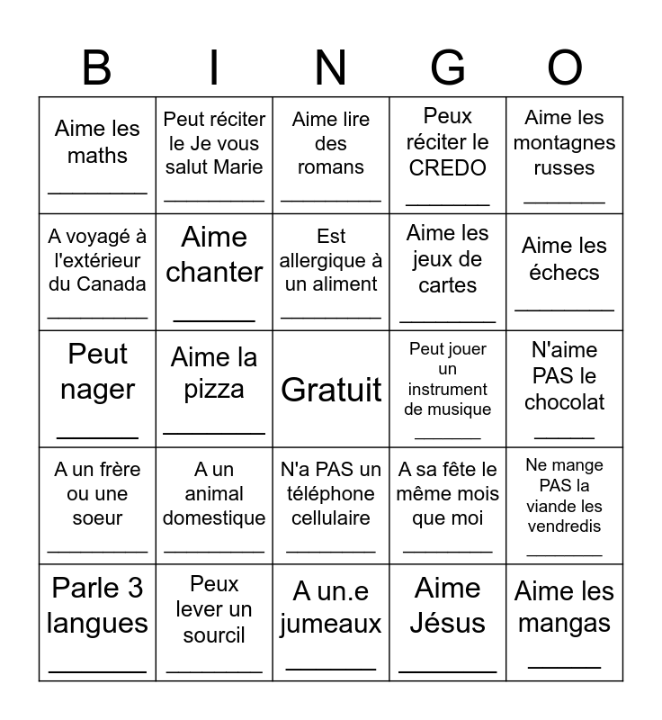 This bingo card has a free space and 29 words: Parle 3 langues ______, Peux cuire un oeuf _______, Aime la pizza _______, Peut réciter le Gloire au Père ________, Aime les maths ________, Aime lire des romans _________, Aime chanter _____, A un animal domestique _________, Peut jouer un instrument de musique _______, Peux lever un sourcil ________, N'aime PAS le chocolat _____, Aime les mangas _____, A un.e jumeaux ______, Aime Jésus ______, Aime les échecs ________, Est gaucher _______, N'a PAS un téléphone cellulaire ________, A un frère ou une soeur _________, Aime les montagnes russes _______, Peut nager _____, A sa fête le même mois que moi ________, Peut réciter le Notre Père ________, Aime les jeux de cartes ________, A voyagé à l'extérieur du Canada _________, Peux réciter le CREDO _______, Peut réciter le Je vous salut Marie _________, Ne mange PAS la viande les vendredis ________, Est allergique à un aliment _________ and Peut nommer 3 des 7 dons du Saint Esprit _________.