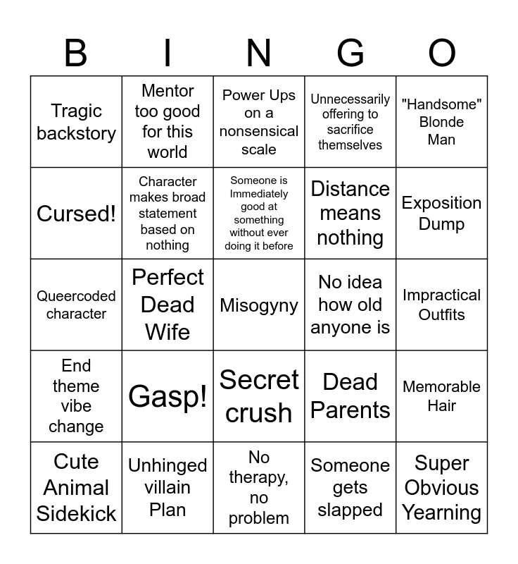 This bingo card has a free space and 24 words: Gasp!, Unhinged villain Plan, Someone is Immediately good at something without ever doing it before, Cute Animal Sidekick, "Handsome" Blonde Man, Tragic backstory, Cursed!, Mentor too good for this world, No idea how old anyone is, Secret crush, Distance means nothing, Queercoded character, Dead Parents, Memorable Hair, Character makes broad statement based on nothing, Someone gets slapped, Impractical Outfits, Power Ups on a nonsensical scale, Exposition Dump, Perfect Dead Wife, Super Obvious Yearning, End theme vibe change, Unnecessarily offering to sacrifice themselves and No therapy, no problem.