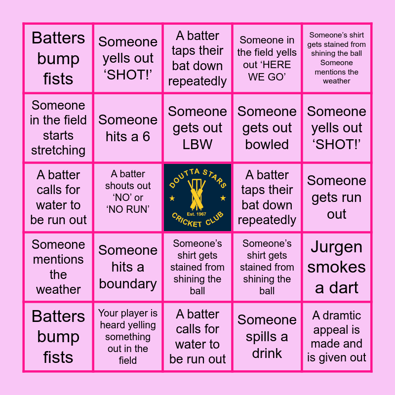This bingo card has a free space and 48 words: A batter adjusts their box, A dramtic appeal is made and is given out, Someone gets run out, A batter calls for water to be run out, Someone hits a boundary, Someone yells out ‘BOWLER’ or ‘KEEPER’, Someone yells out ‘SHOT!’, A batter slaps their pads, Someone in the field starts stretching, A dramatic appeal is made but not given out, Someone hits a 6, Someone in the field yells out ‘HERE WE GO’, Jurgen smokes a dart, Someone’s shirt gets stained from shining the ball, Someone gets caught out, Someone argues with the umpire, Someone gets out LBW, A batter taps their bat down repeatedly, Your player is heard yelling something out in the field, Someone’s shirt gets stained from shining the ball Someone mentions the weather, A batter shouts out ‘NO’ or ‘NO RUN’, Someone spills a drink, Batters bump fists, Someone gets out bowled, A batter adjusts their box, Someone yells out ‘SHOT!’, Batters bump fists, Someone argues with the umpire, Someone’s shirt gets stained from shining the ball, Someone mentions the weather, Someone in the field starts stretching, Someone hits a 6, Someone hits a boundary, Jurgen smokes a dart, Your player is heard yelling something out in the field, Someone gets out LBW, Someone gets out bowled, Someone gets run out, Someone gets caught out, A dramatic appeal is made but not given out, Someone spills a drink, A batter slaps their pads, A batter taps their bat down repeatedly, A batter shouts out ‘NO’ or ‘NO RUN’, A batter calls for water to be run out, Someone in the field yells out ‘HERE WE GO’, Someone yells out ‘BOWLER’ or ‘KEEPER’ and A dramtic appeal is made and is given out.
