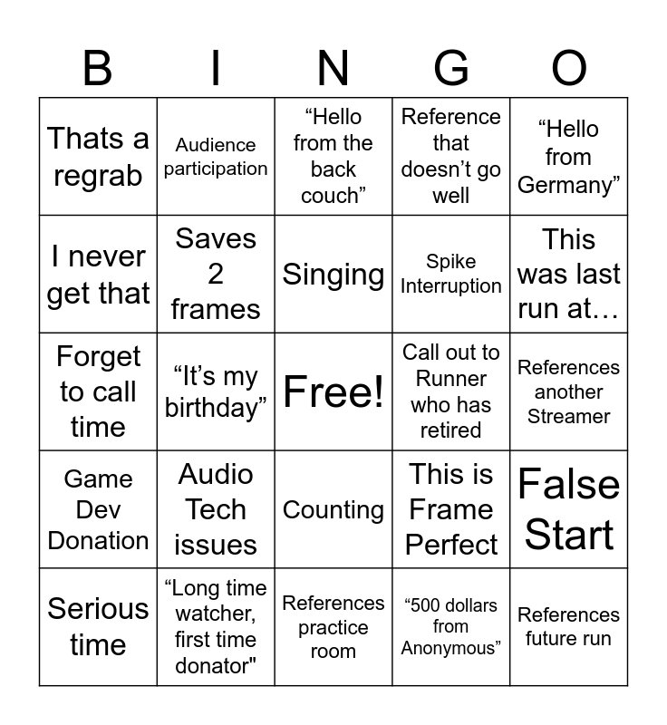 This bingo card has a free space and 39 words: That’s never happened before, First Try, Very difficult… anyway its over, Saves 2 frames, Serious time, Counting, Singing, Hands off, “Hello from Germany”, Game Dev Donation, “It’s my birthday”, Reference that doesn’t go well, References future run, References another Streamer, Call out to Runner who has retired, Audio Tech issues, ORB, Thats a regrab, Honk, This is Frame Perfect, I never get that, References practice room, Spike Interruption, This was last run at…, RNG heavy, really a skill issue, I don’t need to do this, but…, Game Crash, Game runs over time limit, Blink and you’ll miss it, Audience participation, Pun said in donation, Missed something that they needed, “Hello from the back couch”, “Long time watcher, first time donator", “500 dollars from Anonymous”, Mention of Game Bounty, False Start, Forget to call time and Commenter’s curse.