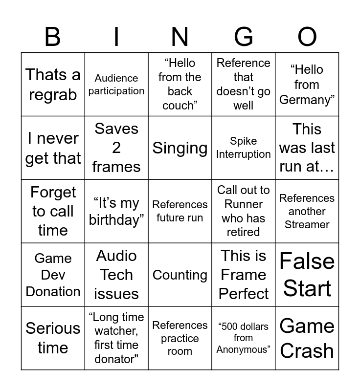 This bingo card has 39 words: That’s never happened before, First Try, Very difficult… anyway its over, Saves 2 frames, Serious time, Counting, Singing, Hands off, “Hello from Germany”, Game Dev Donation, “It’s my birthday”, Reference that doesn’t go well, References future run, References another Streamer, Call out to Runner who has retired, Audio Tech issues, ORB, Thats a regrab, Honk, This is Frame Perfect, I never get that, References practice room, Spike Interruption, This was last run at…, RNG heavy, really a skill issue, I don’t need to do this, but…, Game Crash, Game runs over time limit, Blink and you’ll miss it, Audience participation, Pun said in donation, Missed something that they needed, “Hello from the back couch”, “Long time watcher, first time donator", “500 dollars from Anonymous”, Mention of Game Bounty, False Start, Forget to call time and Commenter’s curse.