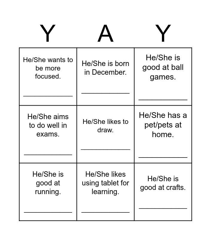 This bingo card has a free space and 8 words: He/She has a pet/pets at home. ___________, He/She is good at ball games. ___________, He/She is born in December. ____________, He/She is good at running. ____________, He/She wants to be more focused. _____________, He/She is good at crafts. ____________, He/She aims to do well in exams. ____________ and He/She likes using tablet for learning. ____________.
