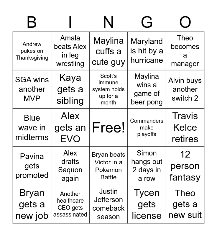 This bingo card has a free space and 24 words: Bryan gets a new job, Alex drafts Saquon again, Scott’s immune system holds up for a month, Tycen gets license, Theo becomes a manager, Andrew pukes on Thanksgiving, Amala beats Alex in leg wrestling, Maylina cuffs a cute guy, Commanders make playoffs, Travis Kelce retires, Blue wave in midterms, Kaya gets a sibling, Simon hangs out 2 days in a row, 12 person fantasy, SGA wins another MVP, Another healthcare CEO gets assassinated, Justin Jefferson comeback season, Maryland is hit by a hurricane, Alvin buys another switch 2, Pavina gets promoted, Alex gets an EVO, Bryan beats Victor in a Pokemon Battle, Maylina wins a game of beer pong and Theo gets a new suit.