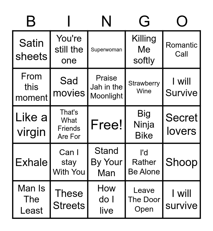 This bingo card has a free space and 33 words: As Soon as You Hang Up the Phone, Blue bayou, Praise Jah in the Moonlight, Don't come back, Secret lovers, Satin sheets, Sad movies, How do I live, Strawberry Wine, I will survive, From this moment, You're still the one, Leave The Door Open, Girls just wanna have fun, Like a virgin, That's What Friends Are For, Stand By Your Man, I'd Rather Be Alone, Shoop, Exhale, These Streets, I will always love you, Killing Me softly, I will Survive, Just An Illusion, Can I stay With You, Superwoman, Big Ninja Bike, Romantic Call, Man Is The Least, Queen Of The Pack, No scrubs and Unbreak My heart.