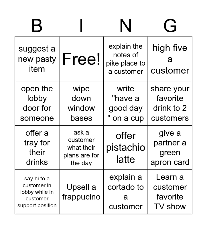 This bingo card has 34 words: Learn a name of a new customer, Offer a pup cup, Take a drink to a customer table, Discover a customer who has a cat, Learn a customer favorite TV show, write "have a good day " on a cup, open the lobby door for someone, Learn a customers favorite breakfast sandwich, Free!, Find a customer in college, share your favorite drink to 2 customers, explain the notes of pike place to a customer, upsell avocado spread, learn a customers favorite season, Upsell a frappucino, ask a customer what their plans are for the day, Compliment a customer, offer pistachio latte, upsell kloud popcorm, explain the notes of pistachio to a customer, learn customers hobby, learn customers job, suggest a new pasty item, explain a cortado to a customer, clean a drain, say hi to a customer in lobby while in customer support position, high five a customer, windex front doors of building, offer a tray for their drinks, wipe down window bases, wipe down table bases in lobby, give a partner a green apron card, give a customer a green apron card and sample a drink with a customer.