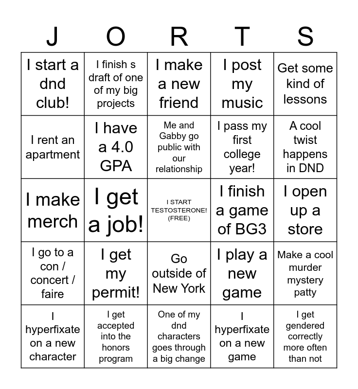 This bingo card has a free space and 24 words: I get my permit!, I get accepted into the honors program, Me and Gabby go public with our relationship, I hyperfixate on a new character, Get some kind of lessons, I start a dnd club!, I rent an apartment, I finish s draft of one of my big projects, I finish a game of BG3, Go outside of New York, I pass my first college year!, I make merch, I play a new game, Make a cool murder mystery patty, I have a 4.0 GPA, I hyperfixate on a new game, I open up a store, I make a new friend, A cool twist happens in DND, I get a job!, I get gendered correctly more often than not, I go to a con / concert / faire, I post my music and One of my dnd characters goes through a big change.