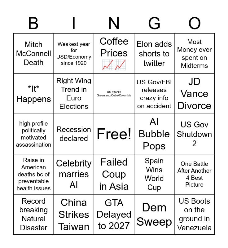 This bingo card has a free space and 24 words: Celebrity marries AI, China Strikes Taiwan, US attacks Greenland/Cuba/Colombia, Record breaking Natural Disaster, Most Money ever spent on Midterms, Mitch McConnell Death, *It* Happens, Weakest year for USD/Economy since 1920, AI Bubble Pops, Failed Coup in Asia, US Gov/FBI releases crazy info on accident, high profile politically motivated assassination, Spain Wins World Cup, One Battle After Another 4 Best Picture, Right Wing Trend in Euro Elections, Dem Sweep, US Gov Shutdown 2, Coffee Prices 📈📈, JD Vance Divorce, Recession declared, US Boots on the ground in Venezuela, Raise in American deaths bc of preventable health issues, Elon adds shorts to twitter and GTA Delayed to 2027.