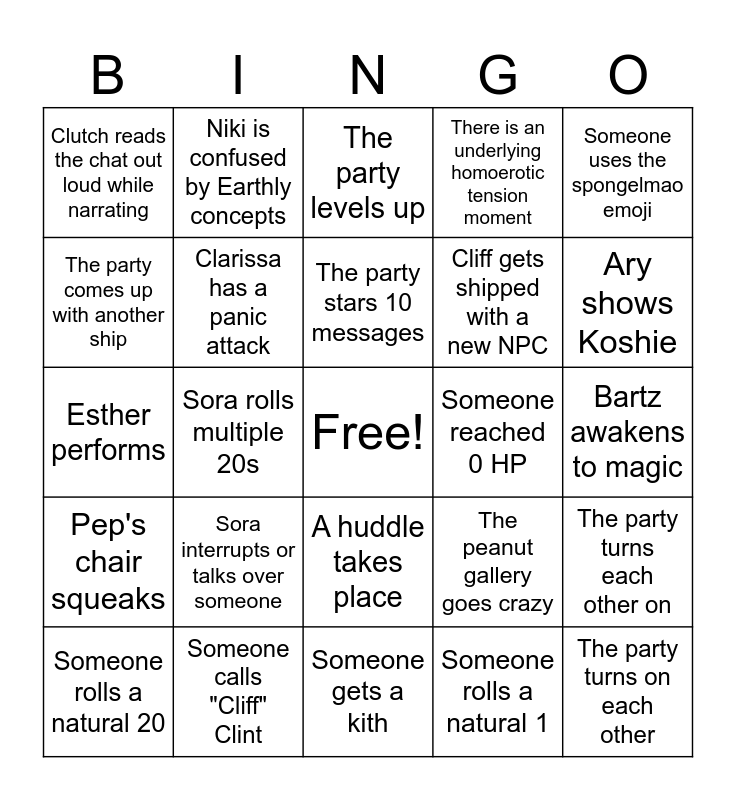 This bingo card has a free space and 24 words: Sora interrupts or talks over someone, Someone calls "Cliff" Clint, The party stars 10 messages, Someone rolls a natural 20, Someone uses the spongelmao emoji, Clutch reads the chat out loud while narrating, The party comes up with another ship, Niki is confused by Earthly concepts, Someone reached 0 HP, A huddle takes place, Cliff gets shipped with a new NPC, Esther performs, The peanut gallery goes crazy, The party turns each other on, Clarissa has a panic attack, Someone rolls a natural 1, Bartz awakens to magic, The party levels up, Ary shows Koshie, Sora rolls multiple 20s, The party turns on each other, Pep's chair squeaks, There is an underlying homoerotic tension moment and Someone gets a kith.