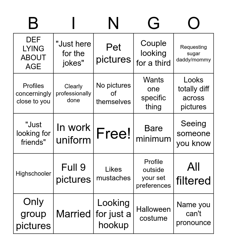 This bingo card has a free space and 24 words: Full 9 pictures, Married, No pictures of themselves, Only group pictures, Requesting sugar daddy/mommy, DEF LYING ABOUT AGE, Profiles concerningly close to you, "Just here for the jokes", Bare minimum, Likes mustaches, Wants one specific thing, "Just looking for friends", Profile outside your set preferences, All filtered, Clearly professionally done, Halloween costume, Seeing someone you know, Pet pictures, Looks totally diff across pictures, In work uniform, Name you can't pronounce, Highschooler, Couple looking for a third and Looking for just a hookup.