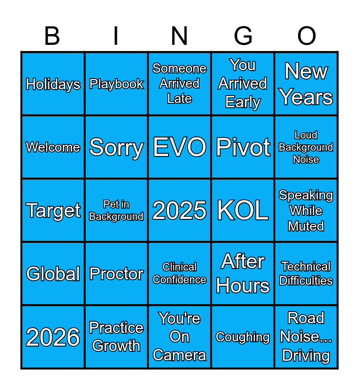 This bingo card has a free space and 24 words: Proctor, Practice Growth, EVO, 2026, New Years, Holidays, Welcome, Playbook, KOL, Clinical Confidence, Pivot, Target, After Hours, Technical Difficulties, Sorry, Coughing, Speaking While Muted, Someone Arrived Late, Loud Background Noise, Pet in Background, Road Noise... Driving, Global, You Arrived Early and You're On Camera.