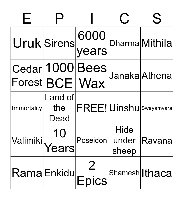 This bingo card has a free space and 24 words: 10 Years, Enkidu, Bees Wax, Rama, Mithila, Uruk, Cedar Forest, Sirens, Uinshu, Poseidon, Janaka, Immortality, Hide under sheep, Ravana, 1000 BCE, Shamesh, Swayamvara, 6000 years, Athena, Land of the Dead, Ithaca, Valimiki, Dharma and 2 Epics.