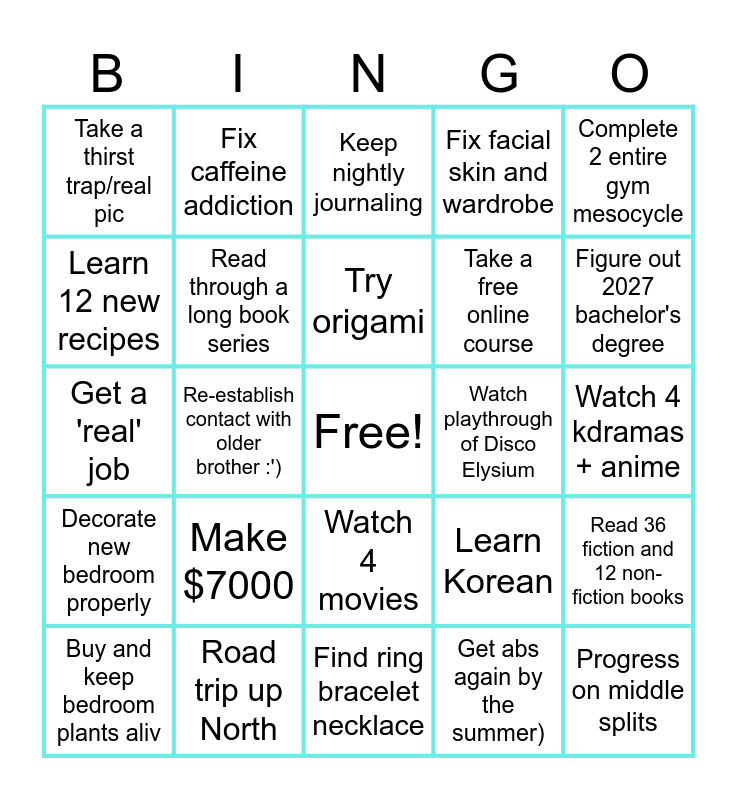 This bingo card has a free space and 24 words: Make $7000, Road trip up North, Try origami, Buy and keep bedroom plants aliv, Complete 2 entire gym mesocycle, Take a thirst trap/real pic, Learn 12 new recipes, Fix caffeine addiction, Watch playthrough of Disco Elysium, Watch 4 movies, Take a free online course, Get a 'real' job, Learn Korean, Read 36 fiction and 12 non-fiction books, Read through a long book series, Get abs again by the summer), Watch 4 kdramas + anime, Keep nightly journaling, Figure out 2027 bachelor's degree, Re-establish contact with older brother :'), Progress on middle splits, Decorate new bedroom properly, Fix facial skin and wardrobe and Find ring bracelet necklace.