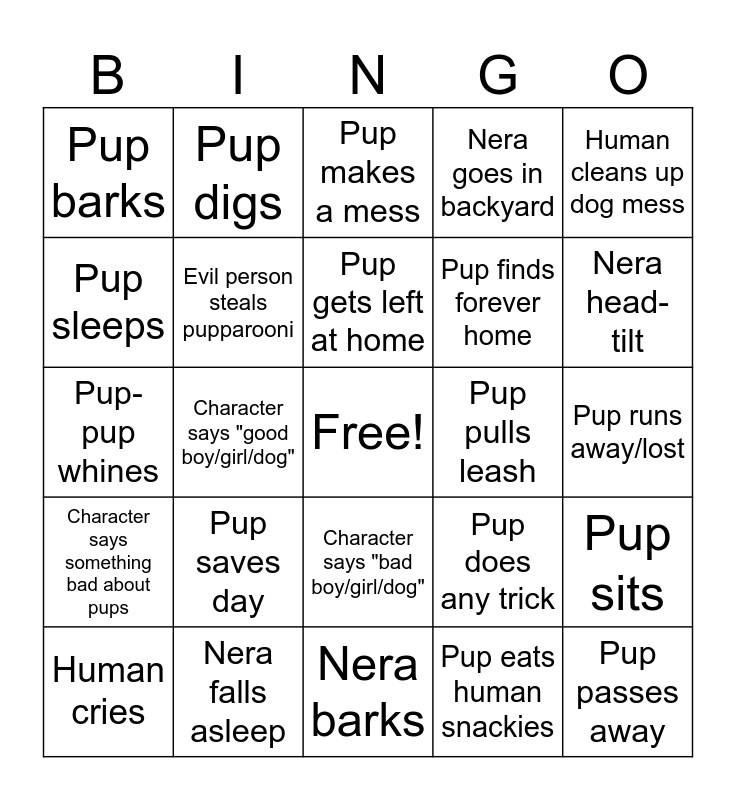 This bingo card has a free space and 24 words: Human cries, Pup saves day, Pup gets left at home, Pup eats human snackies, Human cleans up dog mess, Pup barks, Pup digs, Pup makes a mess, Pup pulls leash, Pup runs away/lost, Pup-pup whines, Evil person steals pupparooni, Pup does any trick, Pup sits, Pup sleeps, Nera falls asleep, Nera barks, Nera goes in backyard, Nera head-tilt, Character says something bad about pups, Character says "good boy/girl/dog", Character says "bad boy/girl/dog", Pup finds forever home and Pup passes away.
