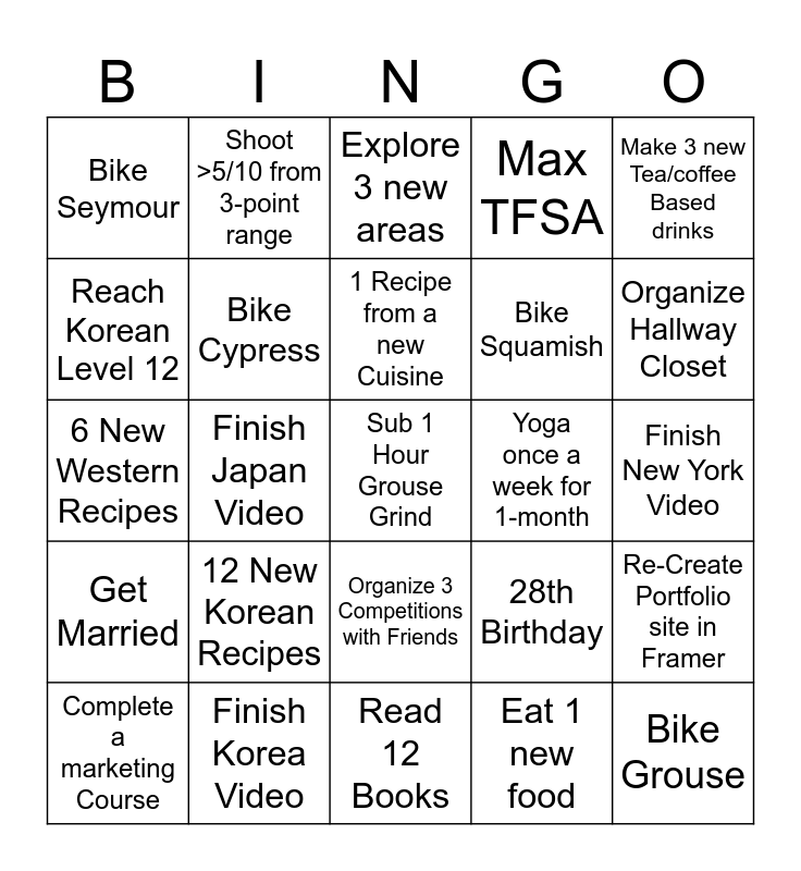 This bingo card has 25 words: 12 New Korean Recipes, Read 12 Books, 1 Recipe from a new Cuisine, Complete a marketing Course, Make 3 new Tea/coffee Based drinks, Bike Seymour, Reach Korean Level 12, Shoot >5/10 from 3-point range, Yoga once a week for 1-month, Organize 3 Competitions with Friends, Bike Squamish, 6 New Western Recipes, 28th Birthday, Re-Create Portfolio site in Framer, Bike Cypress, Bike Grouse, Finish New York Video, Explore 3 new areas, Organize Hallway Closet, Finish Japan Video, Sub 1 Hour Grouse Grind, Finish Korea Video, Get Married, Max TFSA and Eat 1 new food.