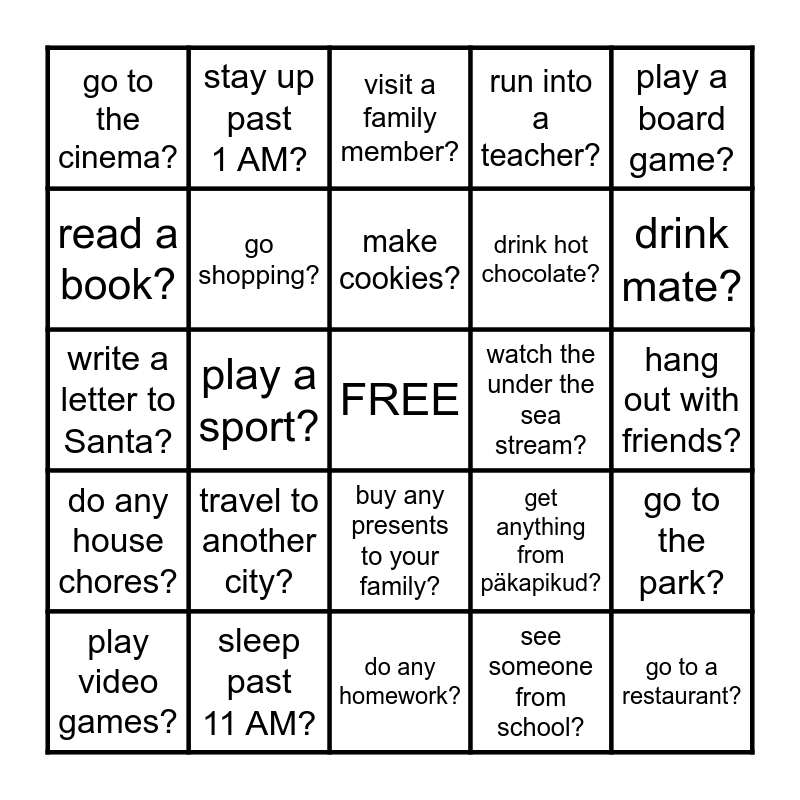 This bingo card has a free space and 24 words: travel to another city?, sleep past 11 AM?, make cookies?, play video games?, play a board game?, go to the cinema?, read a book?, stay up past 1 AM?, watch the under the sea stream?, buy any presents to your family?, drink hot chocolate?, write a letter to Santa?, get anything from päkapikud?, go to the park?, go shopping?, see someone from school?, hang out with friends?, visit a family member?, drink mate?, play a sport?, go to a restaurant?, do any house chores?, run into a teacher? and do any homework?.