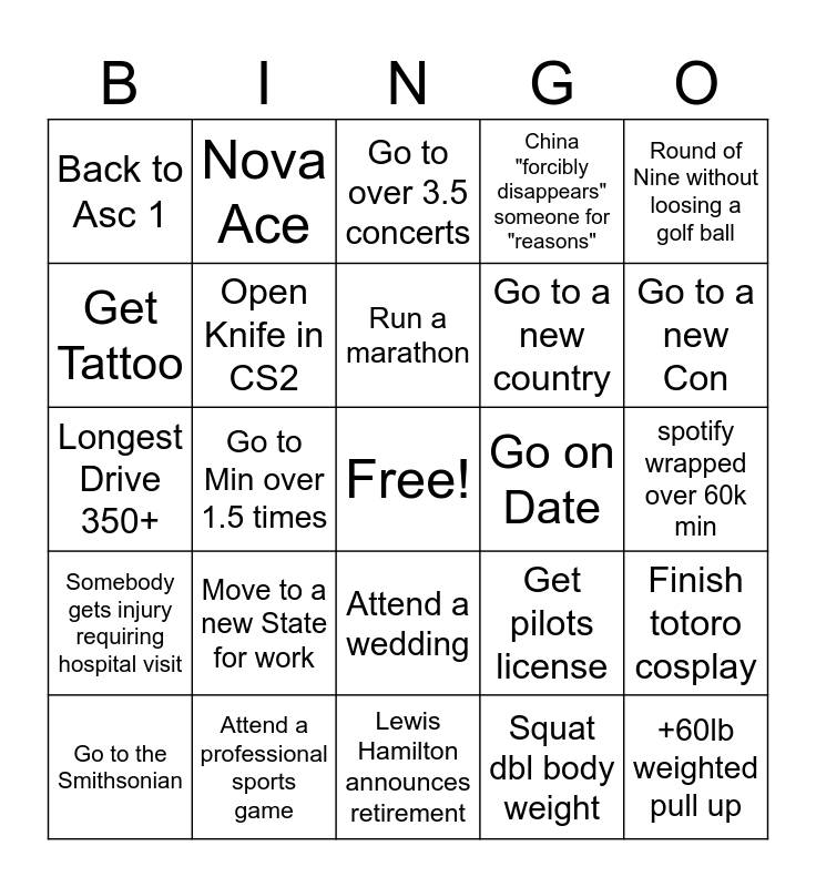 This bingo card has a free space and 24 words: Move to a new State for work, Attend a professional sports game, Run a marathon, Go to the Smithsonian, Round of Nine without loosing a golf ball, Back to Asc 1, Get Tattoo, Nova Ace, Go on Date, Attend a wedding, Go to a new country, Longest Drive 350+, Get pilots license, Finish totoro cosplay, Open Knife in CS2, Squat dbl body weight, spotify wrapped over 60k min, Go to over 3.5 concerts, Go to a new Con, Go to Min over 1.5 times, +60lb weighted pull up, Somebody gets injury requiring hospital visit, China "forcibly disappears" someone for "reasons" and Lewis Hamilton announces retirement.