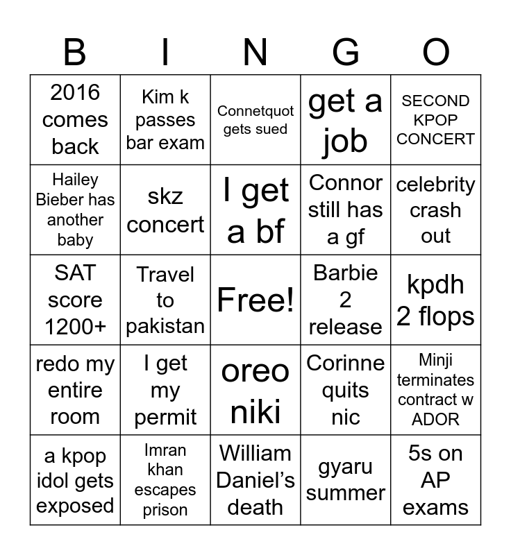 This bingo card has a free space and 24 words: I get my permit, Imran khan escapes prison, I get a bf, a kpop idol gets exposed, SECOND KPOP CONCERT, 2016 comes back, Hailey Bieber has another baby, Kim k passes bar exam, Barbie 2 release, oreo niki, Connor still has a gf, SAT score 1200+, Corinne quits nic, Minji terminates contract w ADOR, skz concert, gyaru summer, kpdh 2 flops, Connetquot gets sued, celebrity crash out, Travel to pakistan, 5s on AP exams, redo my entire room, get a job and William Daniel’s death.