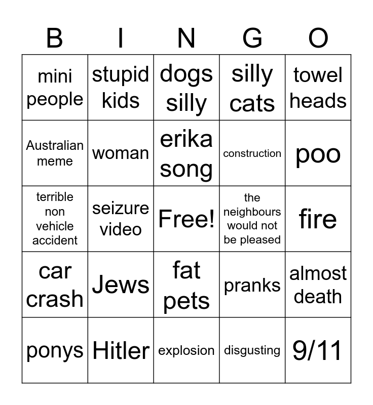 This bingo card has a free space and 24 words: Jews, Hitler, erika song, ponys, towel heads, mini people, Australian meme, stupid kids, the neighbours would not be pleased, fat pets, construction, terrible non vehicle accident, pranks, almost death, woman, disgusting, fire, dogs silly, poo, seizure video, 9/11, car crash, silly cats and explosion.