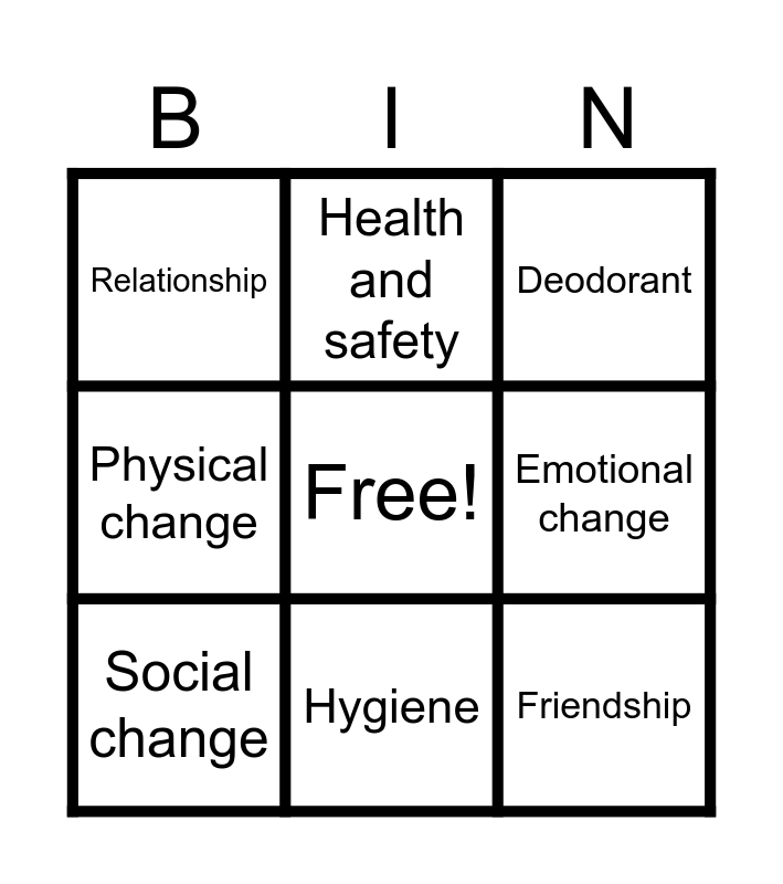 This bingo card has a free space and 8 words: Emotional change, Deodorant, Health and safety, Social change, Relationship, Friendship, Physical change and Hygiene.