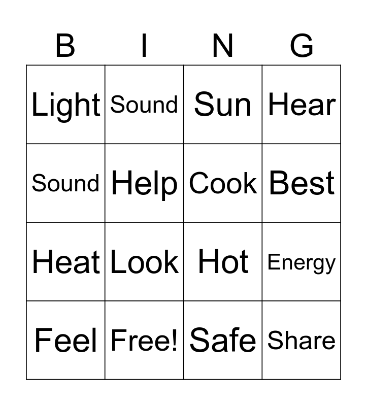 This bingo card has 16 words: Free!, Energy, Sun, Light, Heat, Sound, Hot, Safe, Sound, Help, Feel, Hear, Look, Best, Cook and Share.