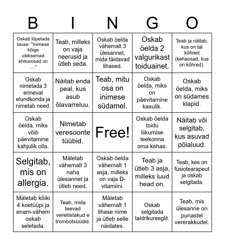 This bingo card has a free space and 25 words: Mäletab vähemalt 3 naha ülesannet ja ütleb need., Mäletab vähemalt 1 lihase nime ja ütleb selle näidates., Teab, mitu osa on inimese südamel., Mäletab kõiki 4 koetüüpi ja enam-vähem oskab seletada., Teab ja näitab, kus on tal kõhred (kehaosad, kus on kõhred)., Oskab lõpetada lause: "Inimese kõige väiksemad ehitusosad on ....", Oskab nimetada 3 erinevat elundkonda ja nimetab need., Teab, milleks on vaja neerusid ja ütleb seda., Oskab öelda toidu liikumise teekonna oma kehas., Oskab öelda vähemalt 1 asja, milleks on vaja D-vitamiini., Oskab öelda, miks on päevitamine kasulik., Oskab öelda, miks võib päevitamine kahjulik olla., Teab ja ütleb 3 asja, milleks luud head on., Teab, kes on füsiotearapeut ja oskab selgitada., Näitab enda peal, kus asub õlavarreluu., Näitab enda peal, kus asub kiiruluu., Näitab või selgitab, kus asuvad pöialuud., Oskab öelda vähemalt 3 ülesannet, mida täidavad lihased., Oskab öelda, miks on südames klapid., Nimetab veresoonte tüübid., Teab, mis ülesanne on punastel vererakkudel., Teab, mida teevad vereliistakud e trombotsüüdid., Selgitab, mis on allergia., Oskab öelda 2 valgurikast toiduainet. and Oskab selgitada taldrikureeglit..