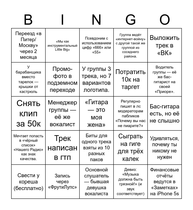 This bingo card has a free space and 24 words: Трек написан в гтп, Запись через «ФрутиЛупс», У группы 3 трека, но 7 вариантов логотипа., Свести у кореша (бесплатно), Выложить трек в «ВК», Переезд «в Питер/Москву» через 2 месяца, У барабанщика вместо тарелок — крышки от кастрюль, «Мы как инструментальный Little Big», Регулярно пишет в лс модераторам пабликов «Почему вы нас не пиарите?», Биты для одного трека взяты из 10 разных паков, Потратить 10к на таргет, Снять клип за 50к, Сыграть на гиге для трёх калек, Удивляться, почему ты никому не нужен, Промо-фото в подземном переходе, Девиз: «Музыка должна быть грязной!» (и звук соответствует), Бас-гитара есть, но её не слышно, Псевдоним с использованием цифр «666» или «55», Водитель группы — её же бас-гитарист на своей «Приоре»., Менеджер группы — её же вокалист, Финансовые отчёты ведутся в «Заметках» на iPhone 5s, Мечтает попасть в «чёрный список» «Нашего Радио» как знак качества., Группа ведёт «интернет-войну» с другой такой же группой из соседнего района. and Основной слушатель — бывшая девушка вокалиста.