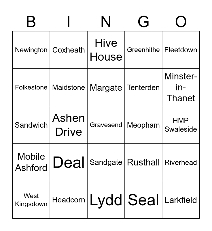 This bingo card has a free space and 108 words: Allington, Ash, Ashen Drive, Ashford, Aylesham, Bearsted, Birchington, Bockhanger, Borough Green, Boughton, Broadstairs, Canterbury, Charing, Cheriton, Cliftonville, Coldharbour, Coxheath, Cranbrook, Dartford, Dashwood, Deal, Dover, East Peckham, Edenbridge, Faversham, Fleetdown, Folkestone, Greenhithe, Hadlow, Hartley, Hawkhurst, Headcorn, Herne Bay, Higham, Hildenborough, Hive House, Hythe, Kemsing, Kings Farm, Larkfield, Lenham, Longfield, Lydd, Lyminge, Madginford, Maidstone, Marden, Margate, Marling Cross, Meopham, Minster-in-Sheppey, Minster-in-Thanet, Mobile Ashford, Mobile Dover, Mobile Maidstone, Mobile Northfleet, Mobile Sturry, New Ash Green, New Romney, Newington, Open Access, Otford, Paddock Wood, Pembury, Quarry Wood (any), Queenborough, Ramsgate, Riverhead, Riverview Park, Rusthall, Sandgate, Sandwich, Seal, Sevenoaks, Sheerness, Shepway, Sherwood, Showfields, Sittingbourne, Snodland, Southborough, St Margarets, Stanhope, Staplehurst, Sturry, Summerhouse, Sutton-at-Hone, Swalecliffe, Swanley, Swanscombe, Temple Hill, Tenterden, Teynham, Tonbridge, Tonbridge North, Tunbridge Wells, Vigo, West Kingsdown, West Malling, Westerham, Westgate, Whitstable, Wood Avenue, Wye, Yalding, HMP Standford Hill, HMP Swaleside and HMP Elmley.