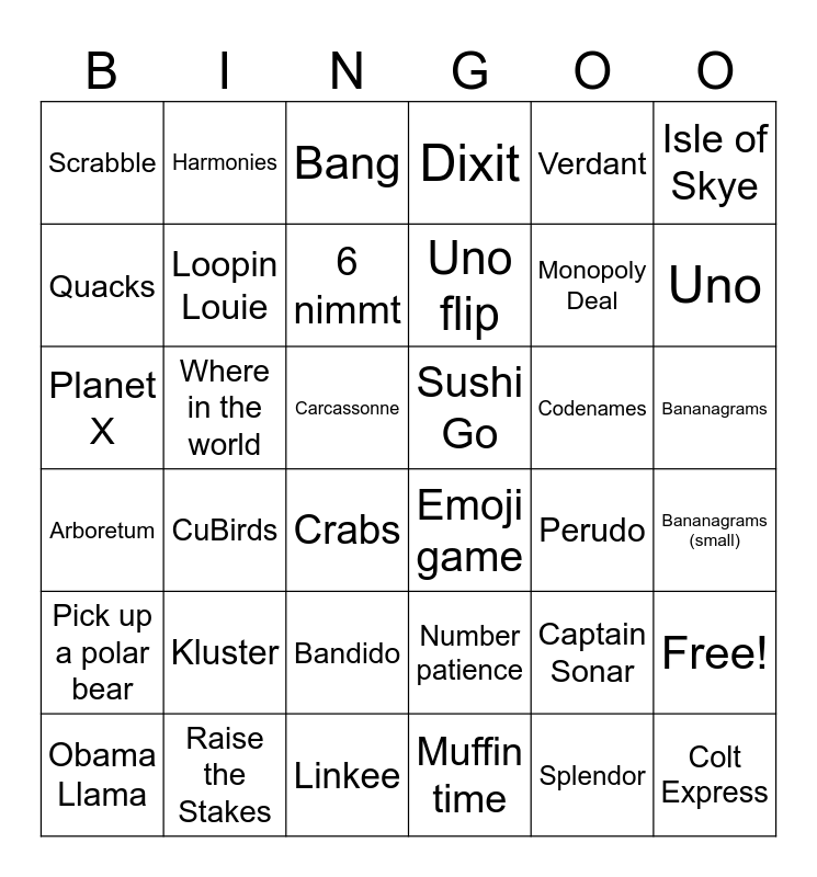 This bingo card has 38 words: Free!, Captain Sonar, Colt Express, Quacks, CuBirds, Codenames, Loopin Louie, Splendor, Verdant, 6 nimmt, Uno, Dixit, Planet X, Carcassonne, Isle of Skye, Sushi Go, Bandido, Bang, Raise the Stakes, Where in the world, Scrabble, Emoji game, Uno flip, Crabs, Linkee, Perudo, Pick up a polar bear, Muffin time, Obama Llama, Number patience, Pass the pigs, Bananagrams, Bananagrams (small), Harmonies, Kluster, Arboretum, Monopoly Deal and Ligretto.