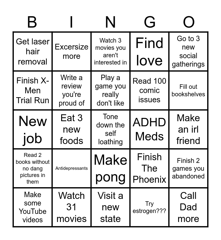 This bingo card has a free space and 24 words: Antidepressants, Watch 31 movies, Play a game you really don't like, Make some YouTube videos, Go to 3 new social gatherings, Get laser hair removal, Finish X-Men Trial Run, Excersize more, ADHD Meds, Make pong, Read 100 comic issues, New job, Finish The Phoenix, Finish 2 games you abandoned, Write a review you're proud of, Try estrogen???, Make an irl friend, Watch 3 movies you aren't interested in, Fill out bookshelves, Eat 3 new foods, Call Dad more, Read 2 books without no dang pictures in them, Find love and Visit a new state.