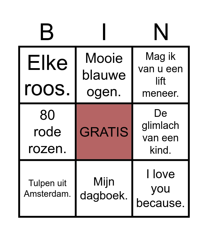 This bingo card has a free space and 20 words: Als de zon schijnt., Toen was geluk heel gewoon., Mag ik van u een lift meneer., Als de sterren aan de hemel staan., De vlinders achterna., I love you because., 't is weer voorbij die mooie zomer., Elke roos., Kleine café aan de haven., Mooie blauwe ogen., Morgen ben ik de bruid., Aan de Amsterdamse grachten., De glimlach van een kind., Vrienden voor het leven., Tulpen uit Amsterdam., Bonnie kom je buitenspelen., Mijn dagboek., 80 rode rozen., Kleine Greetje uit de polder. and Twee motten..