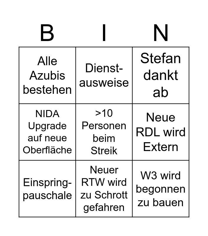 This bingo card has 9 words: Einspring-pauschale, Stefan dankt ab, Dienst-ausweise, NIDA Upgrade auf neue Oberfläche, Alle Azubis bestehen, Neue RDL wird Extern, >10 Personen beim Streik, W3 wird begonnen zu bauen and Neuer RTW wird zu Schrott gefahren.