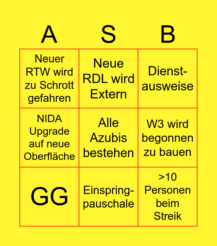 This bingo card has 9 words: GG, Dienst-ausweise, Neue RDL wird Extern, NIDA Upgrade auf neue Oberfläche, Neuer RTW wird zu Schrott gefahren, W3 wird begonnen zu bauen, Alle Azubis bestehen, >10 Personen beim Streik and Einspring-pauschale.