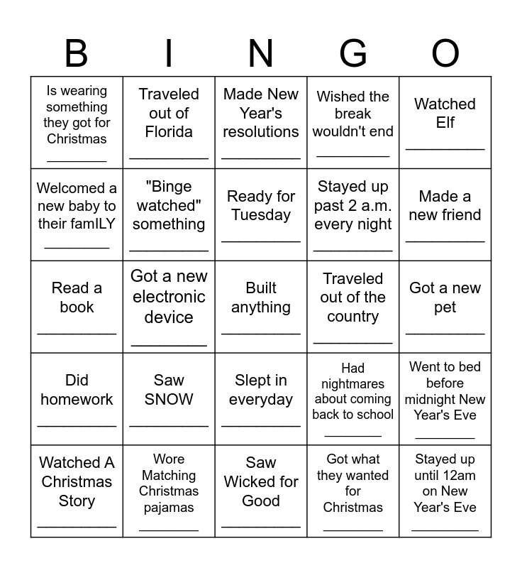 This bingo card has 25 words: Saw SNOW _________, Saw Wicked for Good _________, Ready for Tuesday _________, Watched A Christmas Story _________, Watched Elf _________, Is wearing something they got for Christmas ________, Welcomed a new baby to their famILY ________, Traveled out of Florida _________, Traveled out of the country _________, Slept in everyday _________, Stayed up past 2 a.m. every night _________, Read a book _________, Had nightmares about coming back to school ________, Went to bed before midnight New Year's Eve ________, "Binge watched" something _________, Stayed up until 12am on New Year's Eve _________, Got a new pet _________, Made New Year's resolutions _________, Made a new friend _________, Got a new electronic device ________, Built anything _________, Wore Matching Christmas pajamas ________, Did homework _________, Wished the break wouldn't end _________ and Got what they wanted for Christmas ________.