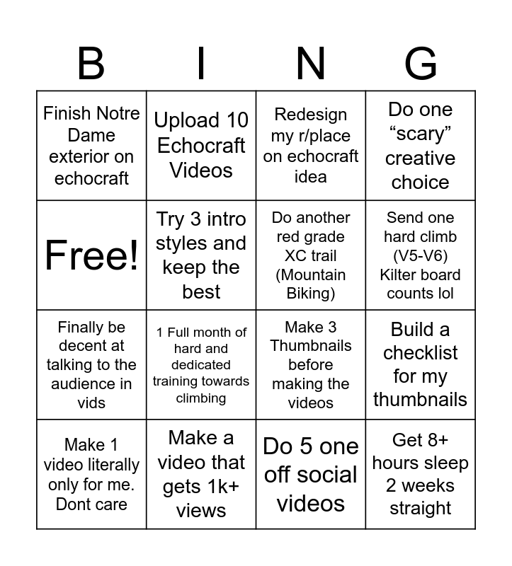 This bingo card has 16 words: Make a video that gets 1k+ views, Build a checklist for my thumbnails, Redesign my r/place on echocraft idea, Finish Notre Dame exterior on echocraft, Finally be decent at talking to the audience in vids, Upload 10 Echocraft Videos, Make 3 Thumbnails before making the videos, Do 5 one off social videos, Free!, Try 3 intro styles and keep the best, Make 1 video literally only for me. Dont care, Do one “scary” creative choice, 1 Full month of hard and dedicated training towards climbing, Send one hard climb (V5-V6) Kilter board counts lol, Do another red grade XC trail (Mountain Biking) and Get 8+ hours sleep 2 weeks straight.
