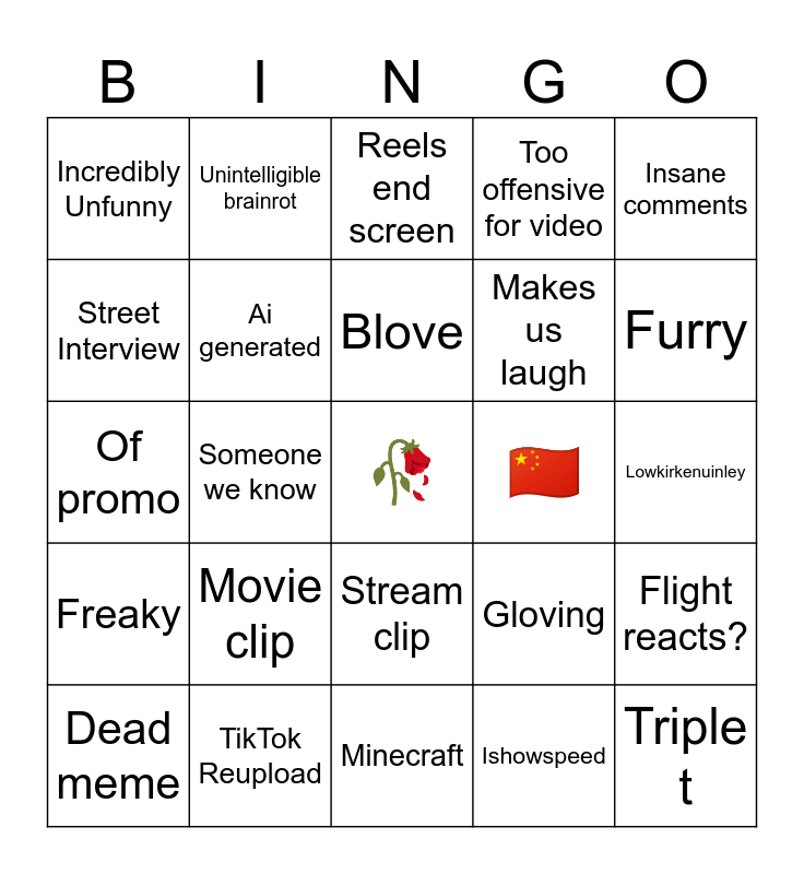 This bingo card has a free space and 24 words: Movie clip, TikTok Reupload, Blove, Dead meme, Insane comments, Incredibly Unfunny, Street Interview, Unintelligible brainrot, 🇨🇳, Stream clip, Makes us laugh, Of promo, Gloving, Flight reacts?, Ai generated, Ishowspeed, Lowkirkenuinley, Reels end screen, Furry, Someone we know, Triple t, Freaky, Too offensive for video and Minecraft.