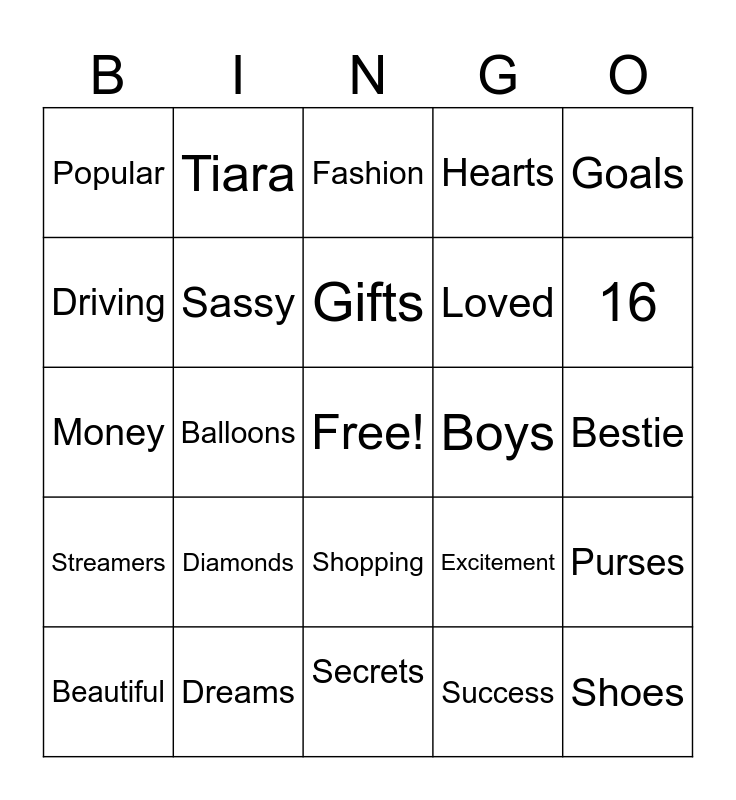 This bingo card has a free space and 24 words: Diamonds, Dreams, Gifts, Beautiful, Goals, Popular, Driving, Tiara, Boys, Shopping, Loved, Money, Excitement, Purses, Sassy, Success, Bestie, Fashion, 16, Balloons, Shoes, Streamers, Hearts and Secrets.