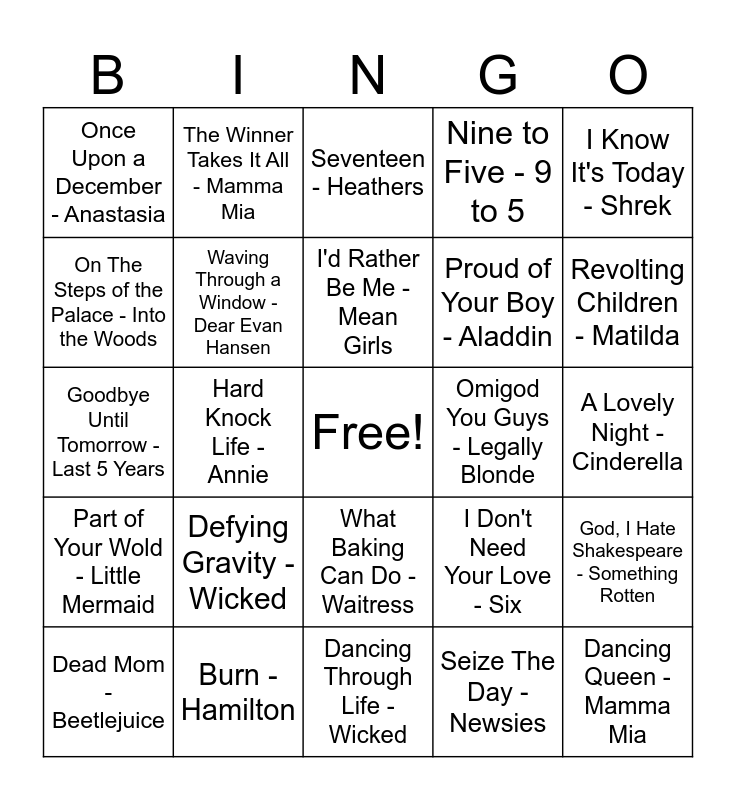 This bingo card has a free space and 24 words: Defying Gravity - Wicked, Burn - Hamilton, I'd Rather Be Me - Mean Girls, Dead Mom - Beetlejuice, I Know It's Today - Shrek, Once Upon a December - Anastasia, On The Steps of the Palace - Into the Woods, The Winner Takes It All - Mamma Mia, Omigod You Guys - Legally Blonde, What Baking Can Do - Waitress, Proud of Your Boy - Aladdin, Goodbye Until Tomorrow - Last 5 Years, I Don't Need Your Love - Six, God, I Hate Shakespeare - Something Rotten, Waving Through a Window - Dear Evan Hansen, Seize The Day - Newsies, A Lovely Night - Cinderella, Seventeen - Heathers, Revolting Children - Matilda, Hard Knock Life - Annie, Dancing Queen - Mamma Mia, Part of Your Wold - Little Mermaid, Nine to Five - 9 to 5 and Dancing Through Life - Wicked.