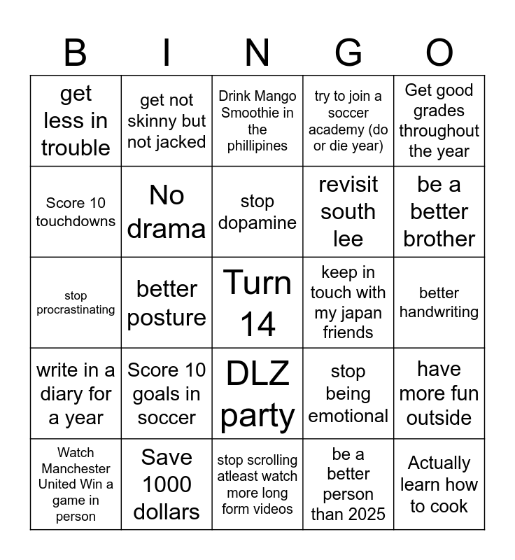 This bingo card has a free space and 24 words: Score 10 goals in soccer, Save 1000 dollars, stop dopamine, Watch Manchester United Win a game in person, Get good grades throughout the year, get less in trouble, Score 10 touchdowns, get not skinny but not jacked, keep in touch with my japan friends, DLZ party, revisit south lee, stop procrastinating, stop being emotional, have more fun outside, No drama, be a better person than 2025, better handwriting, Drink Mango Smoothie in the phillipines, be a better brother, better posture, Actually learn how to cook, write in a diary for a year, try to join a soccer academy (do or die year) and stop scrolling atleast watch more long form videos.