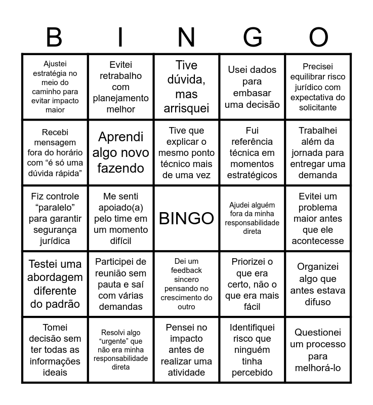 This bingo card has a free space and 24 words: Participei de reunião sem pauta e saí com várias demandas, Resolvi algo “urgente” que não era minha responsabilidade direta, Tive que explicar o mesmo ponto técnico mais de uma vez, Tomei decisão sem ter todas as informações ideais, Precisei equilibrar risco jurídico com expectativa do solicitante, Ajustei estratégia no meio do caminho para evitar impacto maior, Recebi mensagem fora do horário com “é só uma dúvida rápida”, Evitei retrabalho com planejamento melhor, Ajudei alguém fora da minha responsabilidade direta, Dei um feedback sincero pensando no crescimento do outro, Fui referência técnica em momentos estratégicos, Fiz controle “paralelo” para garantir segurança jurídica, Priorizei o que era certo, não o que era mais fácil, Organizei algo que antes estava difuso, Aprendi algo novo fazendo, Identifiquei risco que ninguém tinha percebido, Evitei um problema maior antes que ele acontecesse, Tive dúvida, mas arrisquei, Trabalhei além da jornada para entregar uma demanda, Me senti apoiado(a) pelo time em um momento difícil, Questionei um processo para melhorá-lo, Testei uma abordagem diferente do padrão, Usei dados para embasar uma decisão and Pensei no impacto antes de realizar uma atividade.