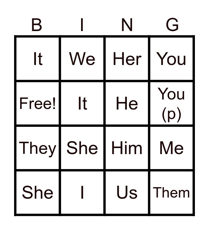 This bingo card has 16 words: I, Me, Her, It, They, We, Him, Us, Free!, It, She, You, She, You (p), He and Them.