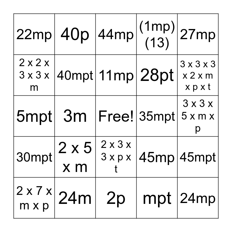 This bingo card has a free space and 24 words: 2 x 5 x m, 24m, 11mp, 2 x 7 x m x p, 27mp, 22mp, 2 x 2 x 3 x 3 x m, 40p, 35mpt, 2 x 3 x 3 x p x t, 28pt, 5mpt, 45mp, 45mpt, 40mpt, mpt, 3 x 3 x 5 x m x p, 44mp, 3 x 3 x 3 x 2 x m x p x t, 3m, 24mp, 30mpt, (1mp)(13) and 2p.
