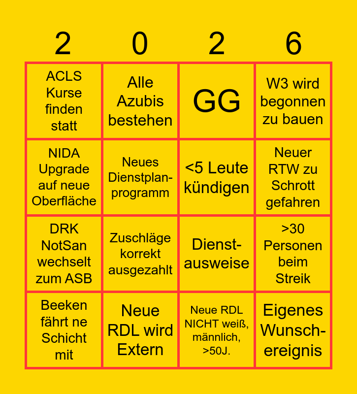 This bingo card has 16 words: Beeken fährt ne Schicht mit, Neue RDL wird Extern, GG, W3 wird begonnen zu bauen, NIDA Upgrade auf neue Oberfläche, Alle Azubis bestehen, Dienst-ausweise, >30 Personen beim Streik, ACLS Kurse finden statt, Neues Dienstplan-programm, Neue RDL NICHT weiß, männlich, >50J., Neuer RTW zu Schrott gefahren, DRK NotSan wechselt zum ASB, Zuschläge korrekt ausgezahlt, <5 Leute kündigen and Eigenes Wunsch-ereignis.