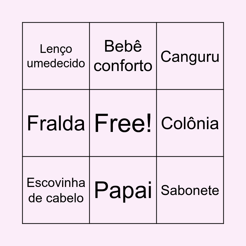 This bingo card has a free space and 51 words: Almofada de Amamentação, Aspirador Nasal, Babá Eletrônica, Babador, Banheira, Bebê, Bebê conforto, Berço, Colônia, Cueiro, Escovinha de cabelo, Fralda, Hidratante, Leite, Óleo para Bebê, Pano de boca, Papai, Poltrona de amamentação, Pomada, Sabonete, Shampoo, Termômetro, Lenço umedecido, Lençol, Body, Luva, Brinquedinhos, Cadeira de alimentação, Calçado, Canguru, Carrinho de bebê, Casaquinho, Chocalho, Chupeta, Tesourinha de unha, Titia, Macacão, Mamadeira, Mamãe, Toalha, Touca, Trocador, Mantinha, Meia, Mordedor, Mijão, Móbile, Vovó, Vovô, Dinda and Dindo.
