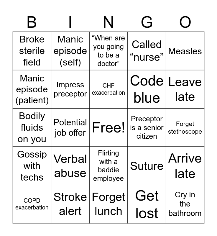 This bingo card has a free space and 24 words: Verbal abuse, Stroke alert, CHF exacerbation, COPD exacerbation, Measles, Broke sterile field, Manic episode (patient), Manic episode (self), Preceptor is a senior citizen, Flirting with a baddie employee, Code blue, Bodily fluids on you, Suture, Arrive late, Impress preceptor, Get lost, Forget stethoscope, “When are you going to be a doctor”, Leave late, Potential job offer, Cry in the bathroom, Gossip with techs, Called “nurse” and Forget lunch.