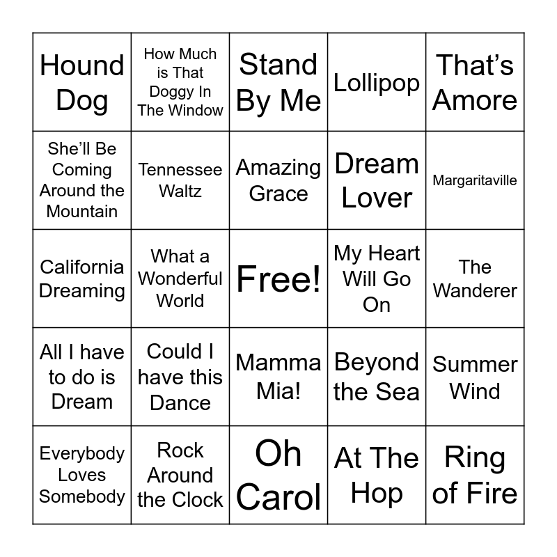This bingo card has a free space and 76 words: Dancing Queen, Voulez Vous, Stand By Me, Sweet Caroline, 9-5, Fly Me To The Moon, You Are My Sunshine, Somewhere Over the Rainbow, Que Sera, Sera, Yellow Submarine, Can’t Help Falling in Love, Edelweiss, Amazing Grace, She’ll Be Coming Around the Mountain, Singing in the Rain, What a Wonderful World, Blue Suede Shoes, Ring of Fire, Leaving on a Jet Plane, That’s Amore, Under the Boardwalk, California Dreaming, Tennessee Waltz, How Much is That Doggy In The Window, Lollipop, All Shook Up, Walkin’ After Midnight, Crazy - Patsy Cline, Put Your Head On My Shoulder, Mr. Sandman, I Walk The Line, Rockin’ Robin, You Send Me, Beyond the Sea, Margaritaville, Dream Lover, Jailhouse Rock, Surfin’ USA, The Wanderer, At The Hop, At Last, I Say A Little Prayer, Oh, Pretty Woman, It’s A Long Way To Tipperary, Sh-Boom (Life Could Be a Dream), Be My Baby, Everybody Loves Somebody, Hound Dog, My Way, King of the Road, Let Me Call You Sweetheart, Mamma Mia!, These Boots are Made for Walking, I’m a Believer, Wild Thing, Lucille, Yesterday, Let It Be, Cracklin’ Rosie, Unchain my Heart, Could I have this Dance, What’s Love Got to Do With It?, Country Roads, Love Me Tender, Bennie and The Jets, With A Little Help From My Friends, My Heart Will Go On, Ain’t That a Kick in The Head, Welcome To My World, Hit The Road Jack, Summer Wind, All I have to do is Dream, Rock Around the Clock, The Sound of Silence, Oh Carol and Blueberry Hill.