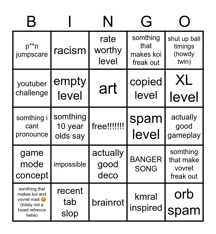This bingo card has a free space and 24 words: impossible, recent tab slop, art, somthing that makes koi and vovret mad 😡(totaly not a howd refrence hehe), shut up ball timings (howdy twin), p**n jumpscare, youtuber challenge, racism, spam level, actually good deco, copied level, somthing i cant pronounce, BANGER SONG, somthing that make vovret freak out, empty level, kmral inspired, actually good gameplay, rate worthy level, XL level, somthing 10 year olds say, orb spam, game mode concept, somthing that makes koi freak out and brainrot.